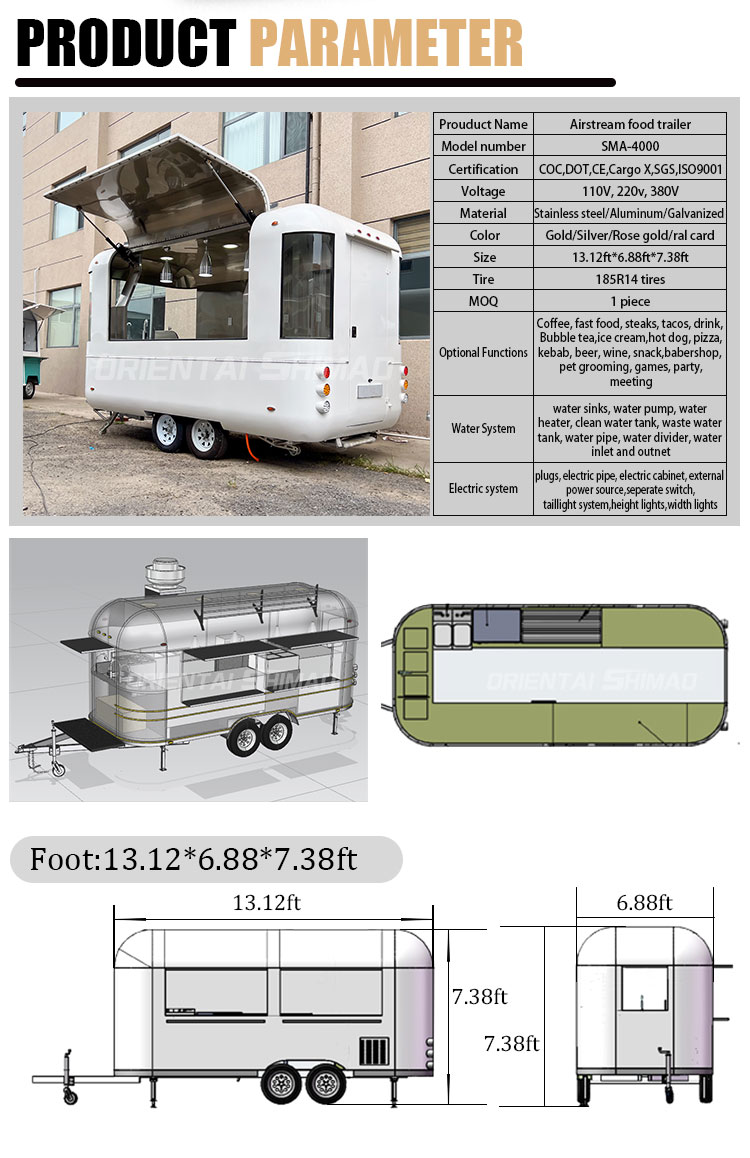 Acciaio inossidabile dorato: l'esterno del food truck è realizzato in acciaio inossidabile dorato di alta qualità. Questo materiale non solo ha un'eccellente resistenza alla corrosione e all'abrasione, ma anche l'aspetto dorato aumenta la bellezza visiva e la sensazione di alta qualità, in modo che il food truck possa risaltare in vari ambienti.