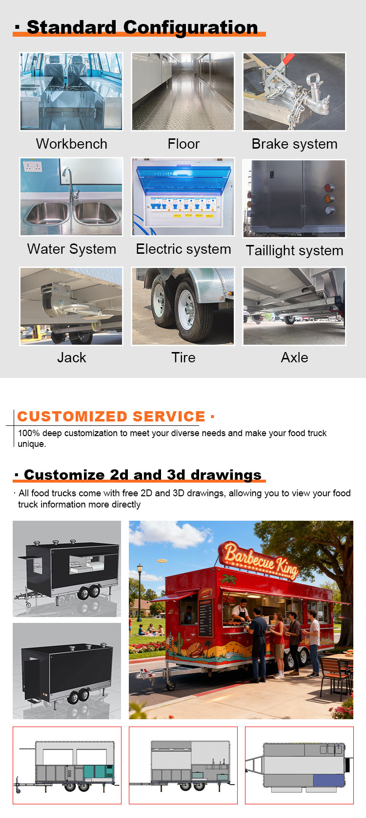 Per il materiale principale, abbiamo scelto l'acciaio inossidabile 304 di alta qualità, noto per la sua eccellente resistenza alla corrosione e l'eccellente durata, e può mantenere prestazioni stabili in una varietà di condizioni ambientali, garantendo che i nostri prodotti per rimorchi per catering alimentare possano mantenere la loro eccellente qualità e funzionalità anche a lungo termine e affrontare una serie di sfide. L'eccellente resistenza dell'acciaio inossidabile 304 alla corrosione, in modo che il camion non sia facilmente influenzato dall'ossidazione o dalla ruggine, il che ne prolunga notevolmente la durata. L'eccellente resistenza alla corrosione dell'acciaio inossidabile 304 rende il camion meno suscettibile all'ossidazione o alla ruggine, prolungandone notevolmente la durata.