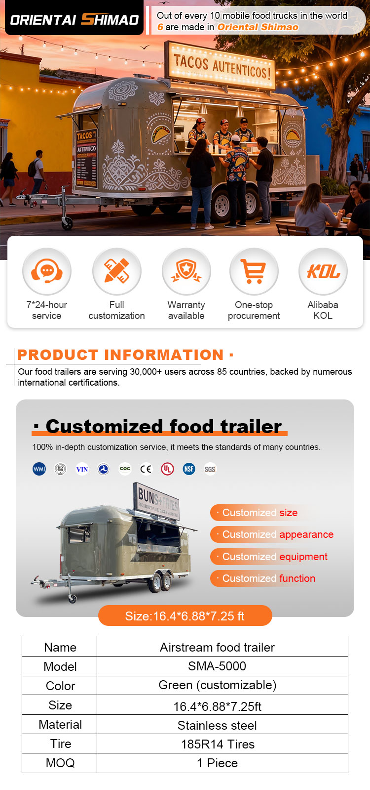Possiamo offrire certificazioni per rimorchi per catering alimentare: DOT, CE, SGS, SCI, ISO, COC,