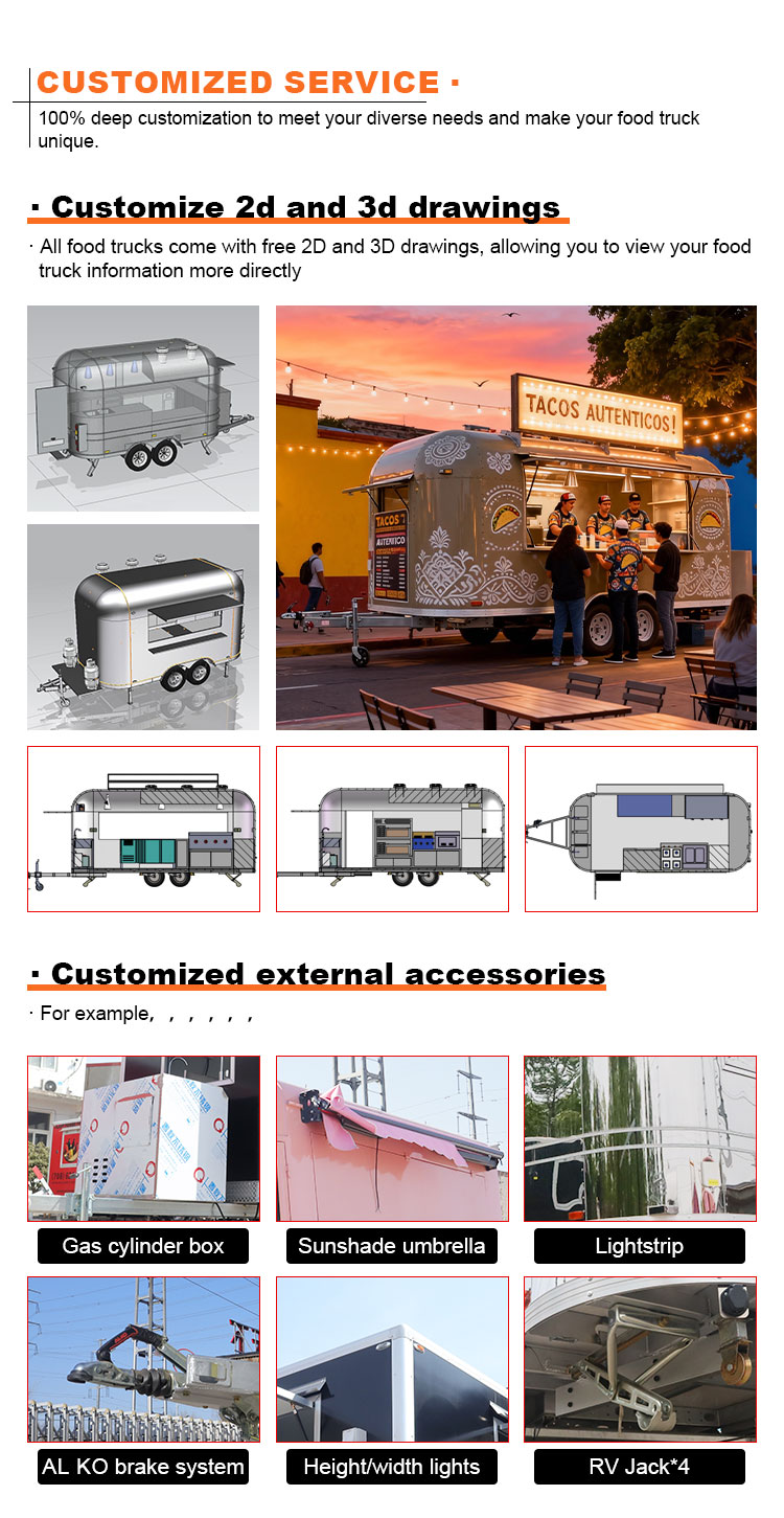 Per il materiale principale, abbiamo scelto l'acciaio inossidabile 304 di alta qualità, noto per la sua eccellente resistenza alla corrosione e l'eccellente durata, e può mantenere prestazioni stabili in una varietà di condizioni ambientali, garantendo che i nostri prodotti per rimorchi per catering alimentare possano mantenere la loro eccellente qualità e funzionalità anche a lungo termine e affrontare una serie di sfide. L'eccellente resistenza dell'acciaio inossidabile 304 alla corrosione, in modo che il camion non sia facilmente influenzato dall'ossidazione o dalla ruggine, il che ne prolunga notevolmente la durata. L'eccellente resistenza alla corrosione dell'acciaio inossidabile 304 rende il camion meno suscettibile all'ossidazione o alla ruggine, prolungandone notevolmente la durata.