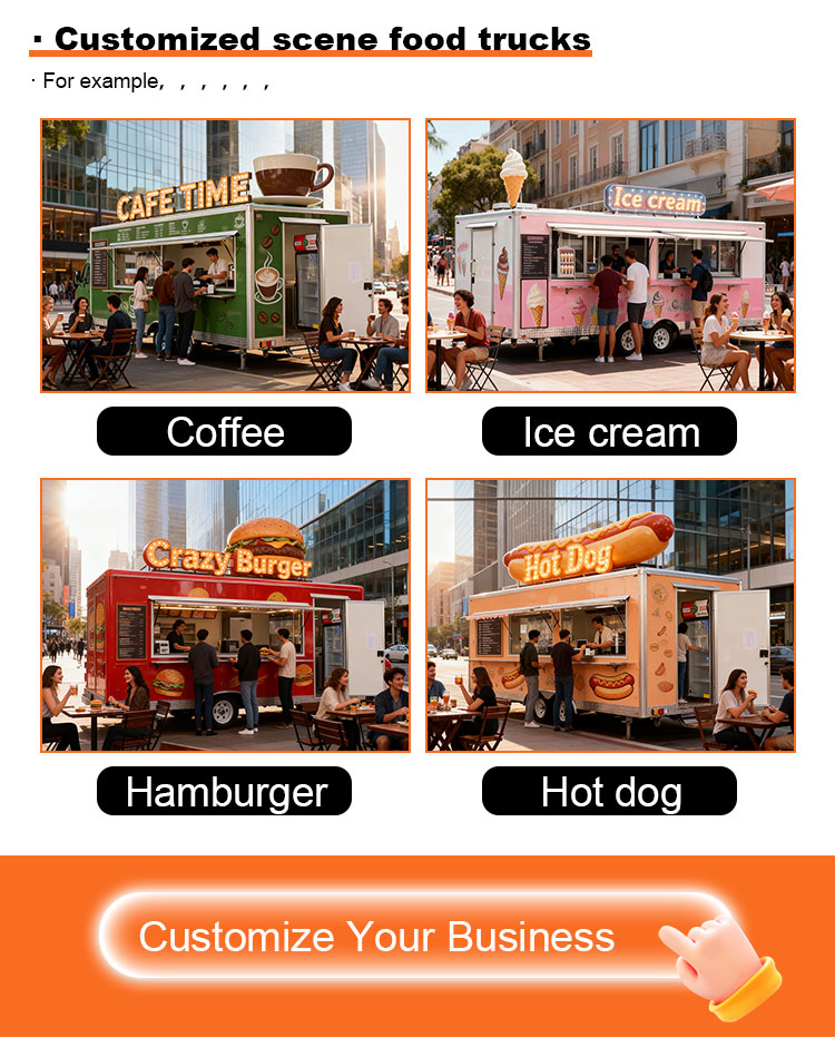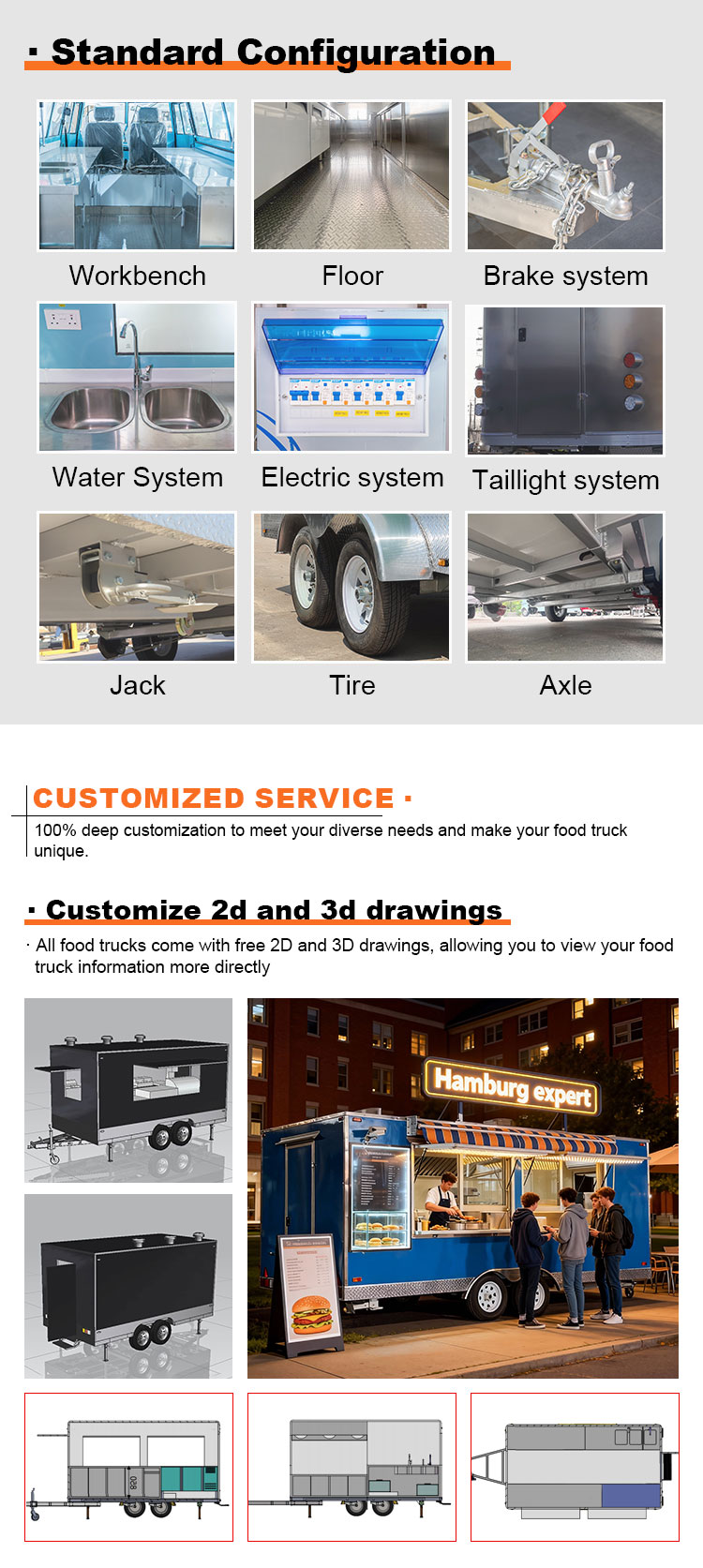 Modellazione e stile: la modellazione e lo stile estetico del food truck sono un fattore importante per attirare i clienti. Può essere personalizzato in base all'immagine del marchio dei clienti, alle caratteristiche aziendali o alle preferenze personali, come design aerodinamico, stile retrò, semplicità moderna e così via.