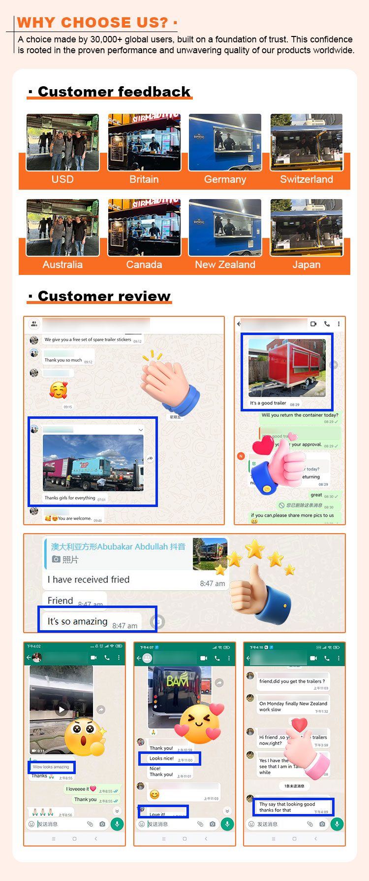Materiale e processo: scegli materiali di alta qualità e un processo di produzione avanzato per garantire che l'aspetto del food truck sia bello e durevole.