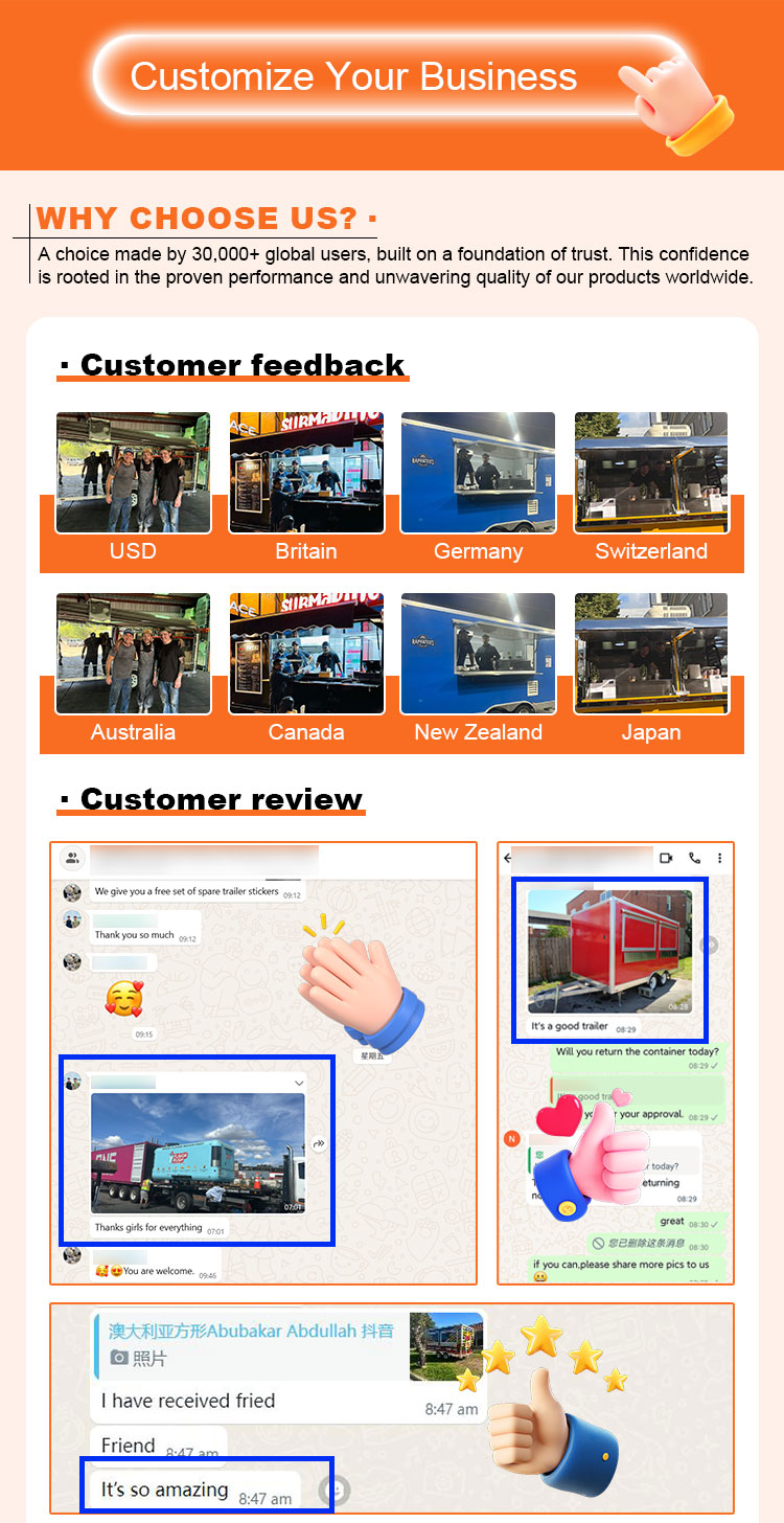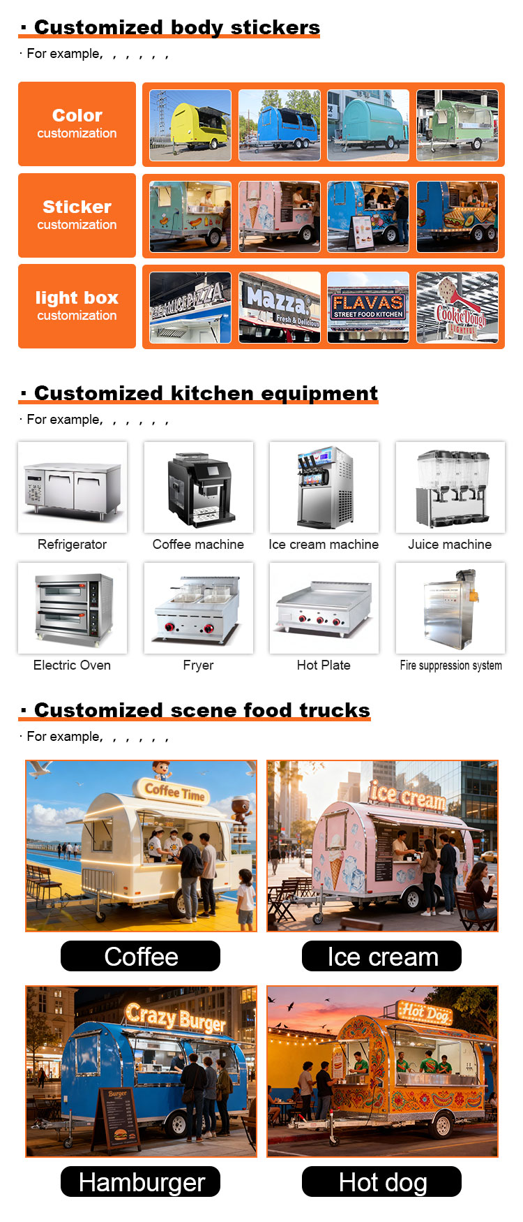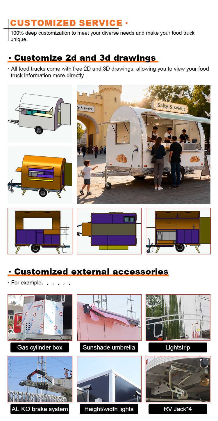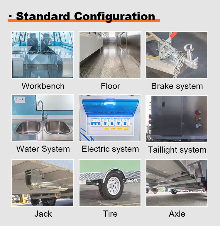 Per quanto riguarda il materiale degli accessori, insistiamo anche su una selezione di alta qualità, comprese maniglie, cerniere e ruote in acciaio inossidabile e altri componenti chiave, tutti realizzati con materiali di alta qualità. Questo design non solo garantisce la consistenza complessiva e l'estetica del Food Van, ma ne migliora ulteriormente la durata e l'affidabilità. Le eccellenti prestazioni degli accessori consentono al Food Van di essere più stabile e fluido durante il processo di utilizzo e riducono anche i costi di manutenzione e sostituzione causati da danni agli accessori, offrendo agli utenti un'esperienza di utilizzo più semplice ed economica.