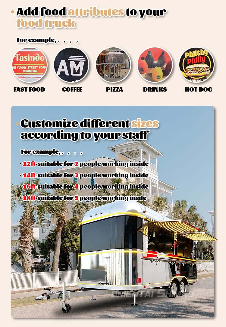 Modellazione e stile: la modellazione e lo stile estetico del food truck sono un fattore importante per attirare i clienti. Può essere personalizzato in base all'immagine del marchio dei clienti, alle caratteristiche aziendali o alle preferenze personali, come design aerodinamico, stile retrò, semplicità moderna e così via.