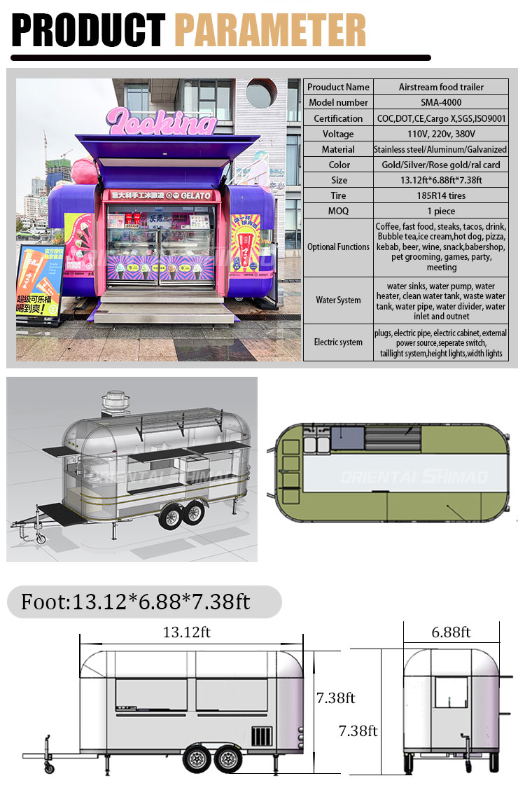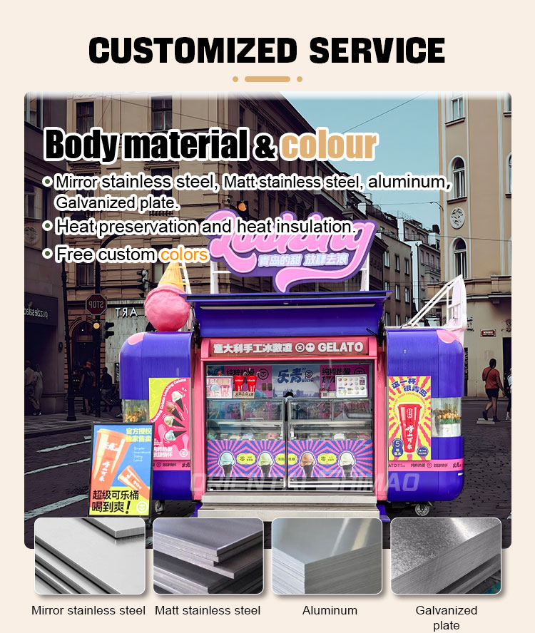 Acciaio inossidabile dorato: l'esterno del food truck è realizzato in acciaio inossidabile dorato di alta qualità. Questo materiale non solo ha un'eccellente resistenza alla corrosione e all'abrasione, ma anche l'aspetto dorato aumenta la bellezza visiva e la sensazione di alta qualità, in modo che il food truck possa risaltare in vari ambienti.