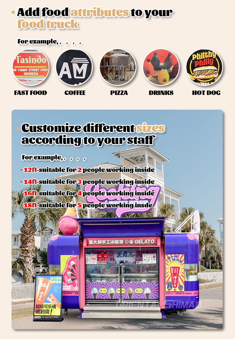 Modellazione e stile: la modellazione e lo stile dell'aspetto del food truck sono un fattore importante per attirare i clienti. Può essere personalizzato in base all'immagine del marchio dei clienti, alle caratteristiche aziendali o alle preferenze personali, come design aerodinamico, stile retrò, semplicità moderna e così via.