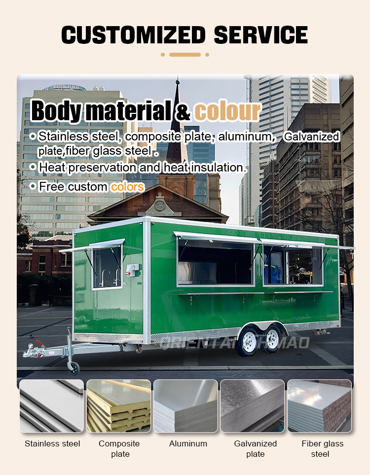 Materiali del corpo: scegli materiali ad alta resistenza, resistenti alla corrosione, facili da pulire e rispettosi dell'ambiente, come acciaio inossidabile, lega di alluminio, ecc., per garantire stabilità, durata e sicurezza del corpo del camion di cibo.