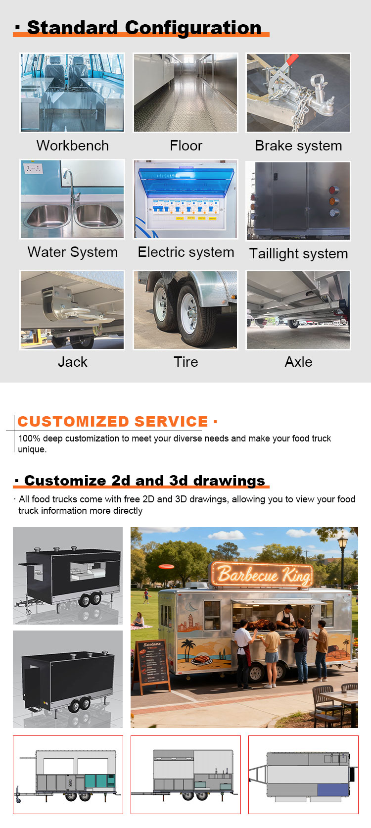 Per il materiale principale, abbiamo scelto l'acciaio inossidabile 304 di alta qualità, noto per la sua eccellente resistenza alla corrosione e l'eccellente durata, e può mantenere prestazioni stabili in una varietà di condizioni ambientali, garantendo che i nostri prodotti per rimorchi mobili per camion di alimenti possano mantenere la loro eccellente qualità e funzionalità anche a lungo termine e affrontare una serie di sfide. L'eccellente resistenza dell'acciaio inossidabile 304 alla corrosione, in modo che il camion non sia facilmente influenzato dall'ossidazione o dalla ruggine, il che ne prolunga notevolmente la durata. L'eccellente resistenza alla corrosione dell'acciaio inossidabile 304 rende il camion meno suscettibile all'ossidazione o alla ruggine, prolungandone notevolmente la durata.