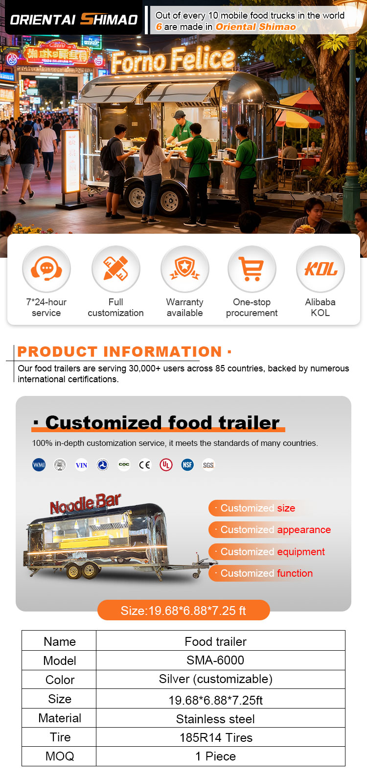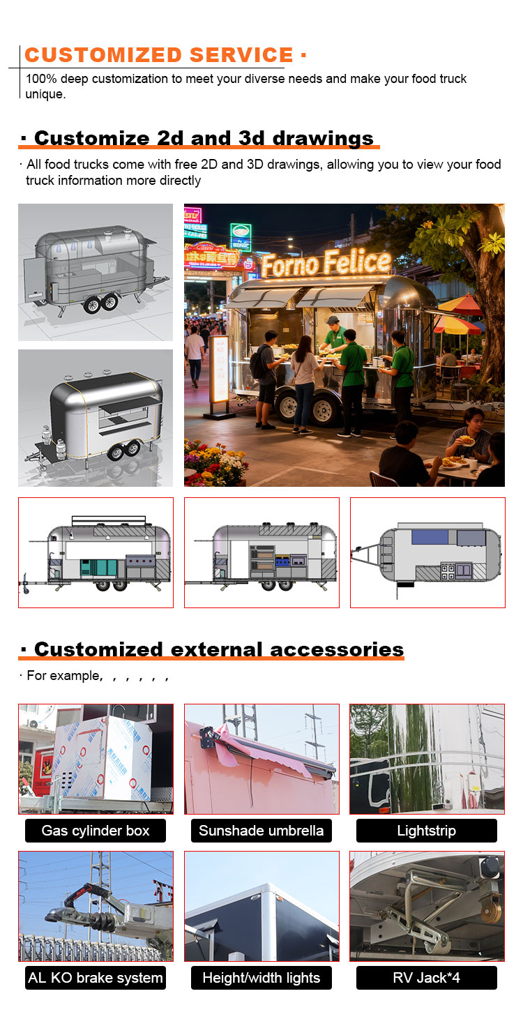 Per il materiale principale, abbiamo scelto l'acciaio inossidabile 304 di alta qualità, noto per la sua eccellente resistenza alla corrosione e l'eccellente durata, e può mantenere prestazioni stabili in una varietà di condizioni ambientali, garantendo che i nostri prodotti per rimorchi per catering alimentare possano mantenere la loro eccellente qualità e funzionalità anche a lungo termine e affrontare una serie di sfide. L'eccellente resistenza dell'acciaio inossidabile 304 alla corrosione, in modo che il camion non sia facilmente influenzato dall'ossidazione o dalla ruggine, il che ne prolunga notevolmente la durata. L'eccellente resistenza alla corrosione dell'acciaio inossidabile 304 rende il camion meno suscettibile all'ossidazione o alla ruggine, prolungandone notevolmente la durata.