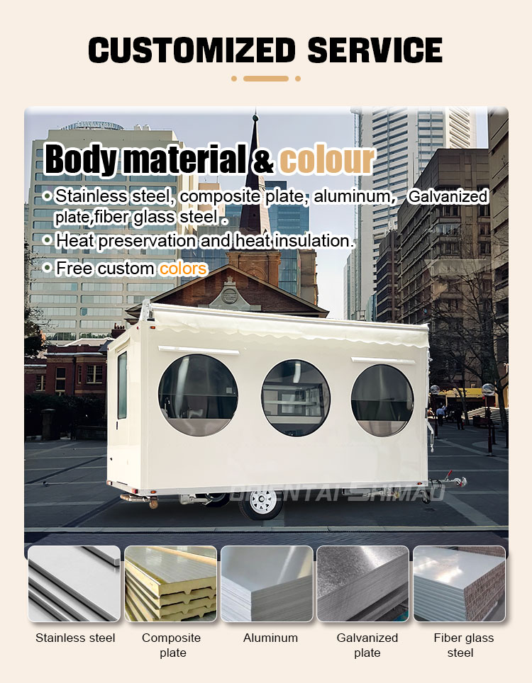 Materiali del corpo: scegli materiali ad alta resistenza, resistenti alla corrosione, facili da pulire e rispettosi dell'ambiente, come acciaio inossidabile, lega di alluminio, ecc., per garantire stabilità, durata e sicurezza del corpo del camion di cibo.