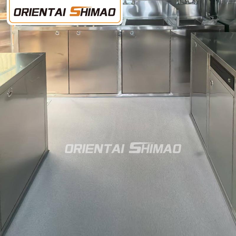 Pavimento a tre strati: il pavimento del food truck è progettato con tre strati. Lo strato superiore è un pavimento in alluminio con superficie antiscivolo per garantire la sicurezza degli operatori; lo strato intermedio è una tavola di legno a prova di insetto importata dall'Australia; e lo strato inferiore è una plastica rinforzata con fibra di vetro, resistente all'umidità e agli insetti e prolunga la durata del pavimento.