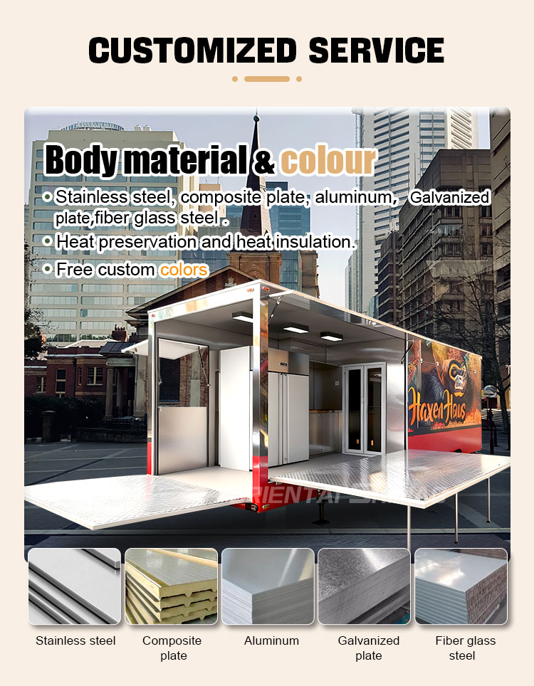 Materiali del corpo: scegli materiali ad alta resistenza, resistenti alla corrosione, facili da pulire e rispettosi dell'ambiente, come acciaio inossidabile, lega di alluminio, ecc., per garantire stabilità, durata e sicurezza del corpo del camion di cibo.