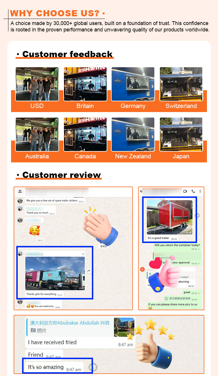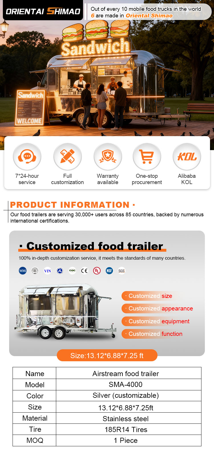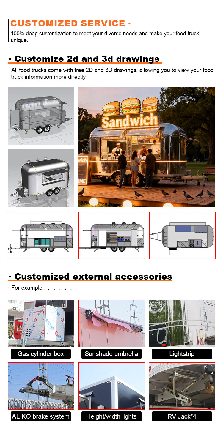 Per il materiale principale, abbiamo scelto l'acciaio inossidabile 304 di alta qualità, noto per la sua eccellente resistenza alla corrosione e l'eccellente durata, e può mantenere prestazioni stabili in una varietà di condizioni ambientali, garantendo che i nostri prodotti Trailer Food Truck possano mantenere la loro eccellente qualità e funzionalità anche a lungo termine e affrontare una serie di sfide. L'eccellente resistenza dell'acciaio inossidabile 304 alla corrosione, in modo che il camion non sia facilmente influenzato dall'ossidazione o dalla ruggine, il che ne prolunga notevolmente la durata. L'eccellente resistenza alla corrosione dell'acciaio inossidabile 304 rende il camion meno suscettibile all'ossidazione o alla ruggine, prolungandone notevolmente la durata.